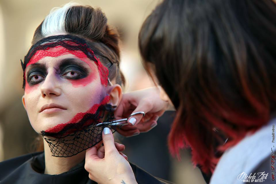La modella, Malvina, ha una pelle un po' particolare: pelle acneica con pitiriasi alba. Infatti, la ciocca bianca nei capelli è (meravigliosamente!) naturale. Kryolan ha dei prodotti specifici per la copertura e la correzione di questi problemi di pelle e l'utilizzo di prodotti speciali, come lo special adhesive, non hanno alcun impatto sulla pelle, ma va rimosso con un prodotto specifico (All Pur, sempre Kryolan).